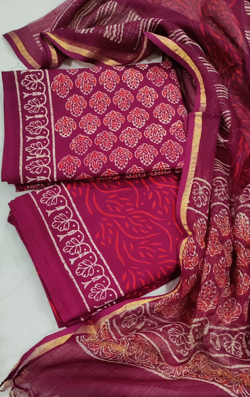 Add timeless elegance to your ethnic wardrobe with this Blockart Hand Block Printed Unstitched Cotton Suit Set, paired beautifully with a lightweight Kota Doria dupatta. Crafted by skilled artisans using traditional hand block printing techniques, this suit set reflects authentic Indian craftsmanship with a contemporary appeal.