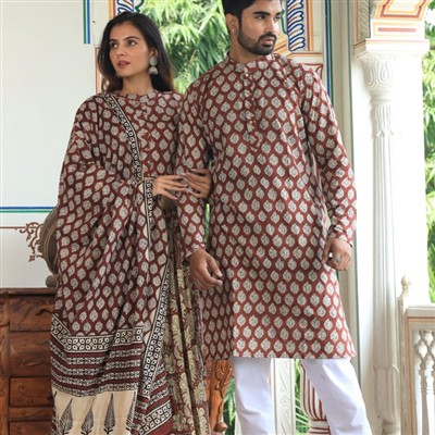 Experience the artistry of hand block printing with this exquisite crimson cotton ensemble. The intricate leaf-like patterns and floral motifs add a touch of traditional charm to your wardrobe. Crafted from premium cotton, these outfits offer comfort and breathability, perfect for any occasion. The woman's ensemble features a flowing kurta with a beautifully patterned dupatta, while the man's attire includes a stylish kurta with white churidar pants. Embrace the elegance of Indian ethnic wear with this artisanal collection.