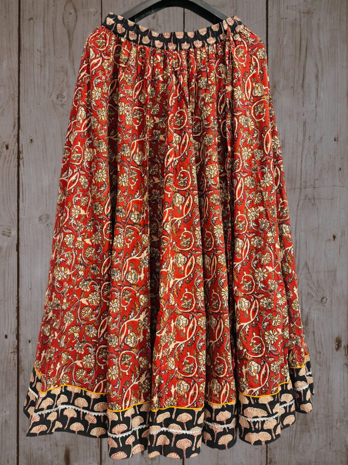Discover the artistry of hand block printing with our exquisite Crimson Floral Cotton Skirt. Crafted from pure cotton (60x60 count), this skirt features a gathered design with a 40-inch length and a 5.5 meters flare made from 28 panels. The elastic waistband ensures a comfortable fit while the contrasting floral border adds a touch of elegance. Perfect for casual or ethnic occasions.