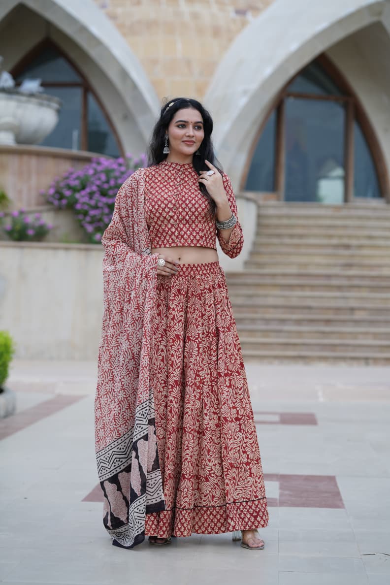 • Package: Bagru Hand Block Printed Designer Crop Top & Skirt with Mulmul Dupatta