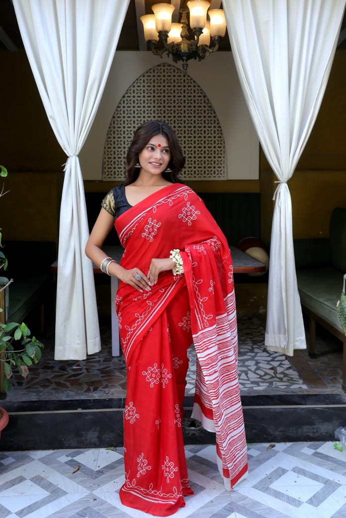Experience the timeless elegance of hand block printing with our Crimson Mulmul Cotton Saree. Crafted from premium cotton, this saree features intricate traditional motifs and a distinct striped pallu for a touch of ethnic charm. The lightweight and smooth fabric ensure comfort all day long. Perfect for casual or semi-formal occasions.