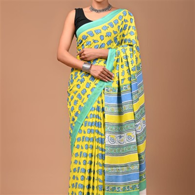 Experience the artistry of hand block printing with our exquisite Mulmul Cotton Saree. Crafted with care, this saree features playful elephant motifs on a bright yellow base, complemented by a light green border and intricate traditional patterns on the pallu. Made from lightweight and smooth cotton, it offers comfort and style for festive or casual occasions.