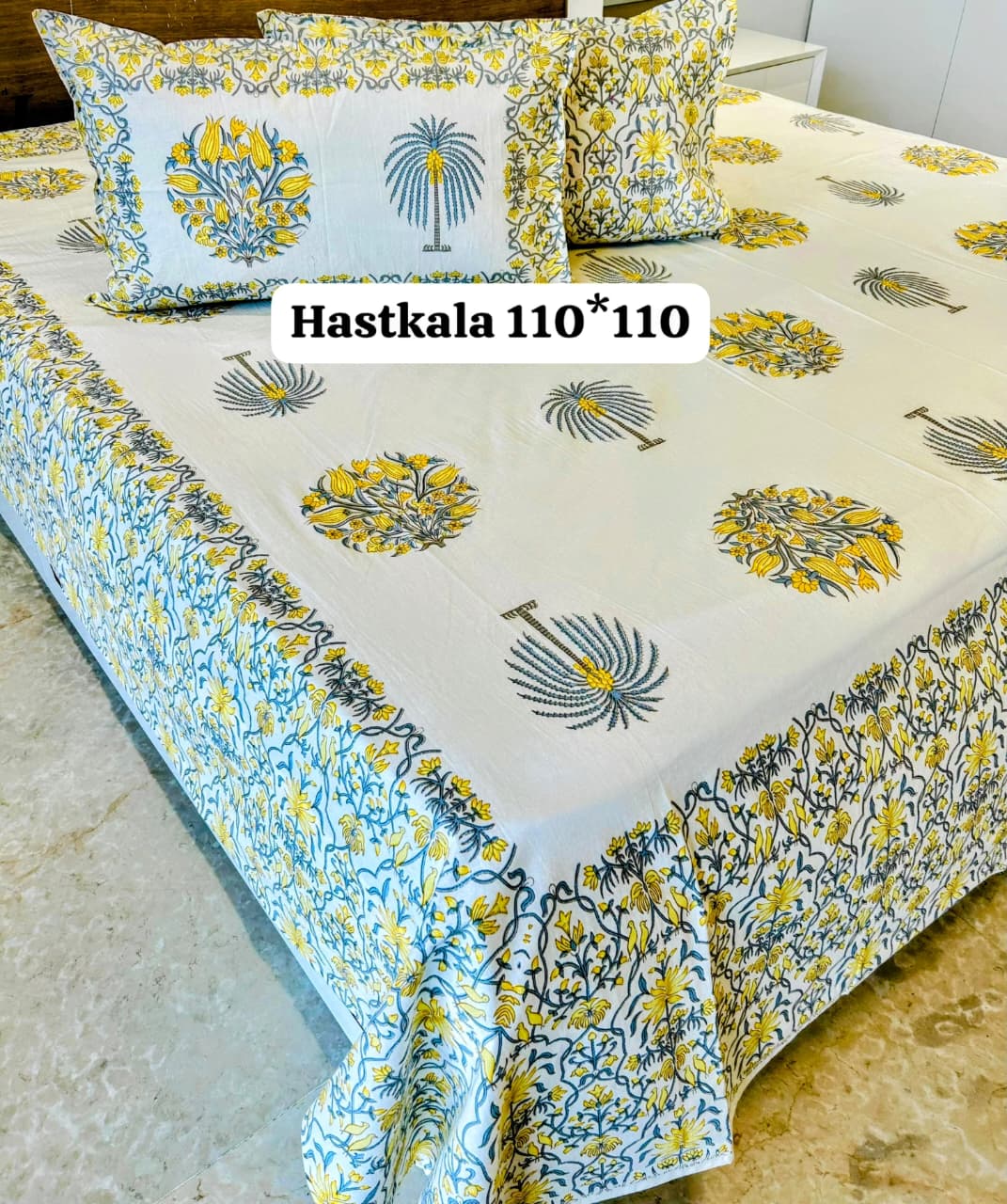 Experience the timeless elegance of hand block printing with our exquisite Floral Cotton Bed Sheet Set. Crafted with premium quality cotton, this jumbo king size set includes a stunning bedsheet measuring 110x110 inches and 2 matching pillow covers. The intricate yellow flowers and blue-gray botanical motifs add a touch of traditional charm to your bedroom decor. Embrace luxury and comfort with our artisanal creation.
