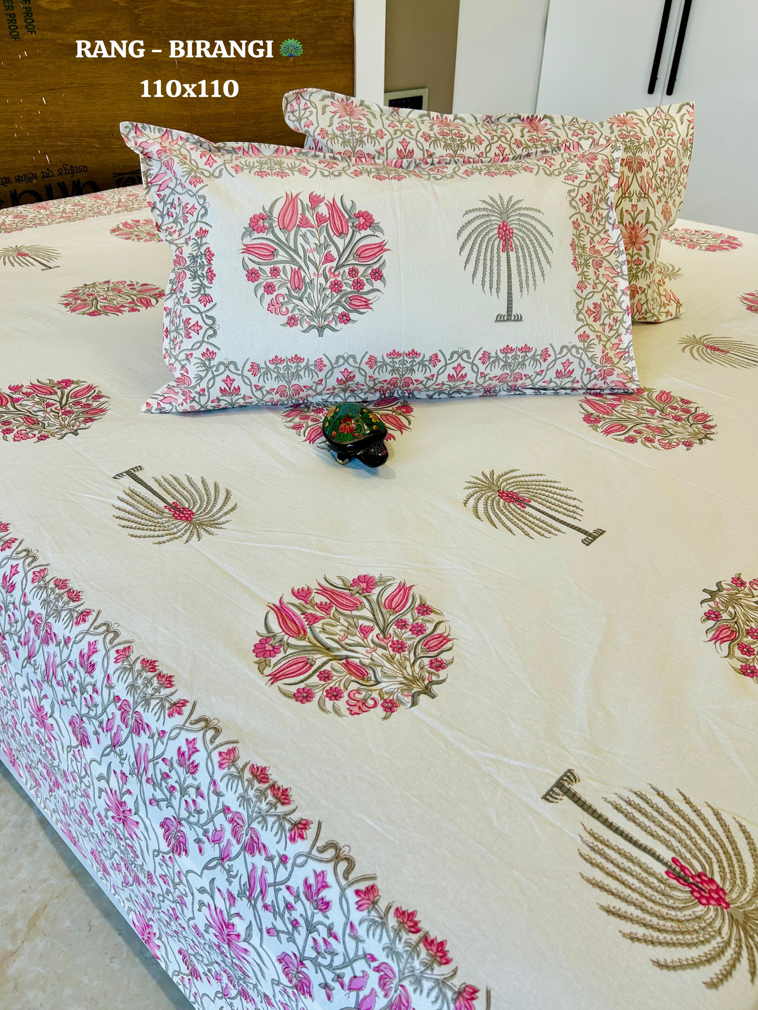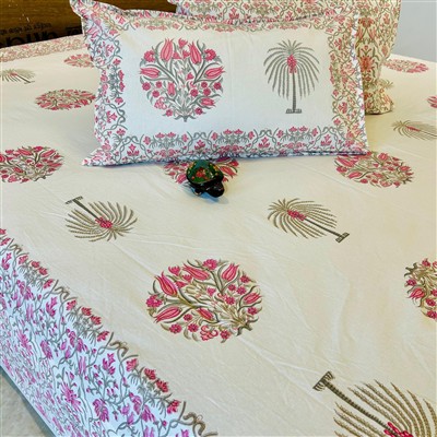 Enhance your bedroom with the timeless elegance of hand block printing with this exquisite Floral Cotton Bed Sheet Set. Crafted from premium quality cotton, this set features intricate floral and botanical patterns in pink and greenish-gray tones. The jumbo king-size bed sheet (110x110 inches) and two pillow covers are adorned with circular floral motifs and palm-like tree prints, accented by a decorative border. Immerse yourself in the comfort and craftsmanship of artisanal Indian textiles. Explore more cotton bedsheets