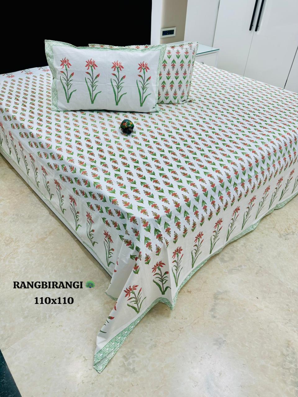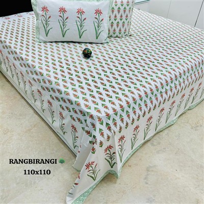 Experience the artistry of hand block printing with our exquisite Floral Cotton Bedding Set. Crafted with premium cotton, this set includes a jumbo king size bedsheet adorned with a beautiful floral pattern in green and red/orange hues. The matching pillow covers enhance the aesthetic appeal, making it a perfect addition to your bedroom decor. Embrace the comfort and elegance of traditional Indian craftsmanship.
