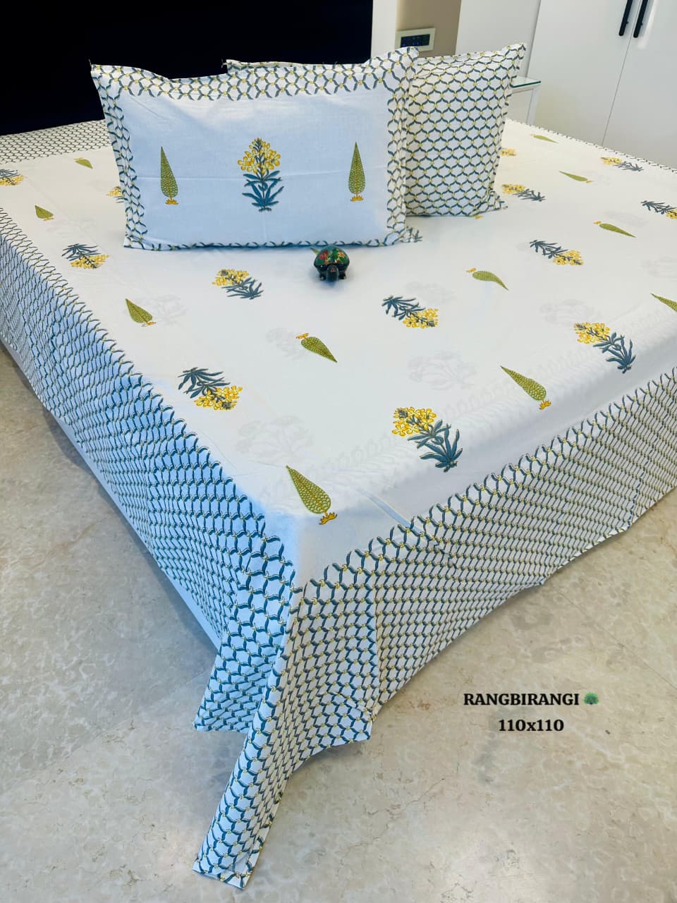 Experience the artistry of hand block printing with our exquisite Floral Cotton Bedsheet Set. Crafted from premium cotton fabric, this set includes a jumbo king-size bedsheet measuring 110x110 inches and two matching pillow covers. The white base adorned with vibrant yellow flowers and green leaves exudes a refreshing charm. The blue and white geometric borders add a touch of elegance, making this set a perfect blend of traditional and contemporary design. Elevate your bedroom decor with this artisanal masterpiece.