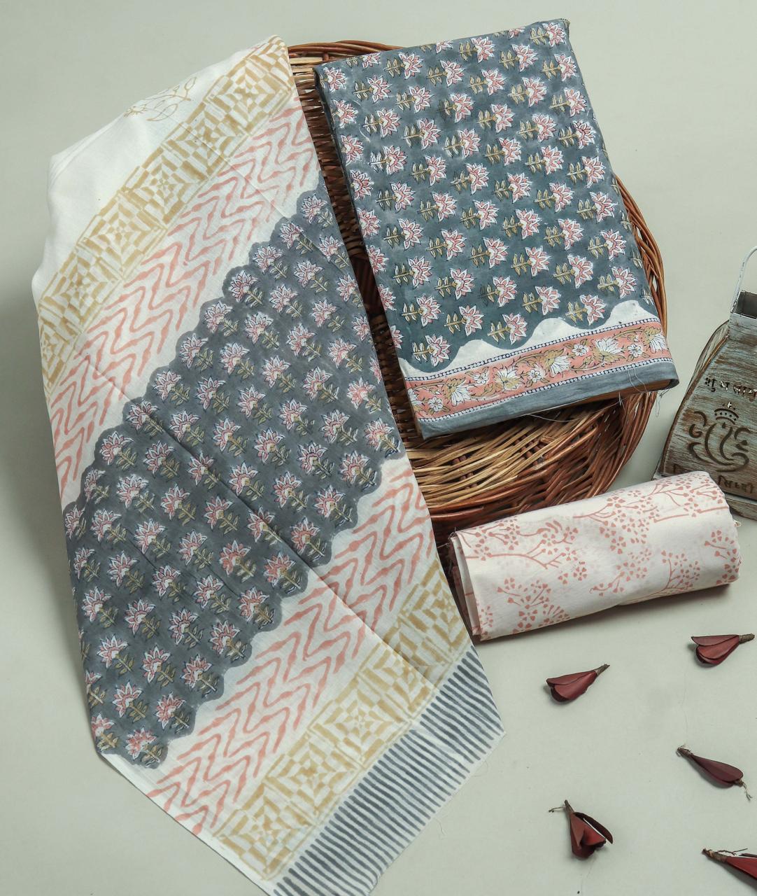 Experience the timeless beauty of hand block printing with this exquisite cotton dress material set. Crafted with care and precision, this set features a floral block print design on soft cotton fabric, offering comfort and elegance. Create your own unique outfit with the coordinated pieces included in this set. The top, bottom, and dupatta are all 2.5 meters long, allowing for versatile styling options. Embrace the artisanal charm of traditional Indian craftsmanship with this premium set.