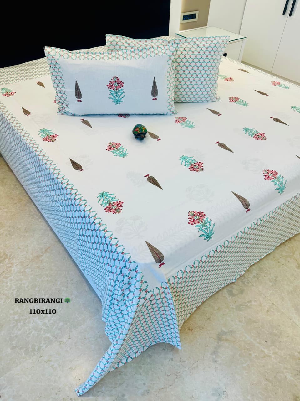Embrace the artistry of Indian craftsmanship with our Hand Block Printed Floral Cotton King Size Bedsheet Set. Made from premium quality cotton, this set features a delicate floral and leaf motif print on the bedsheet complemented by a geometric design on the borders and pillow covers. The jumbo king size ensures a luxurious feel, perfect for enhancing your bedroom decor. Experience the comfort and elegance of traditional hand block printing techniques. Elevate your bedding collection with this exquisite piece.
