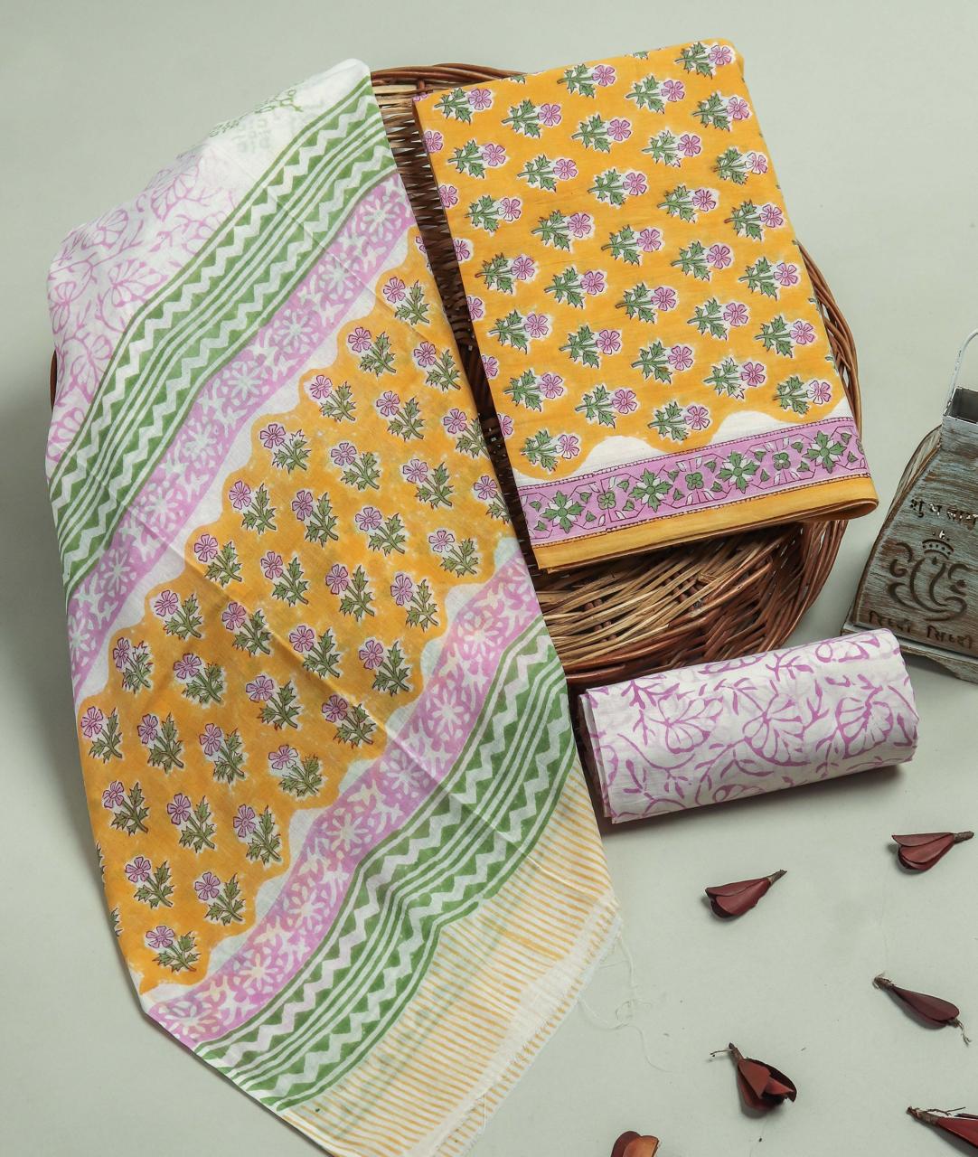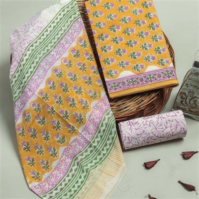 Experience the artistry of hand block printing with this exquisite floral cotton suit set. Crafted with premium cotton fabric, this 3-piece set includes a top, bottom, and dupatta, each 2.5 meters long. The vibrant yellow base adorned with delicate pink flowers and green leaves exudes traditional charm. The intricate green zigzag and floral borders on white and pink add a touch of elegance. Embrace comfort and style with this handcrafted ensemble that reflects true Indian craftsmanship.