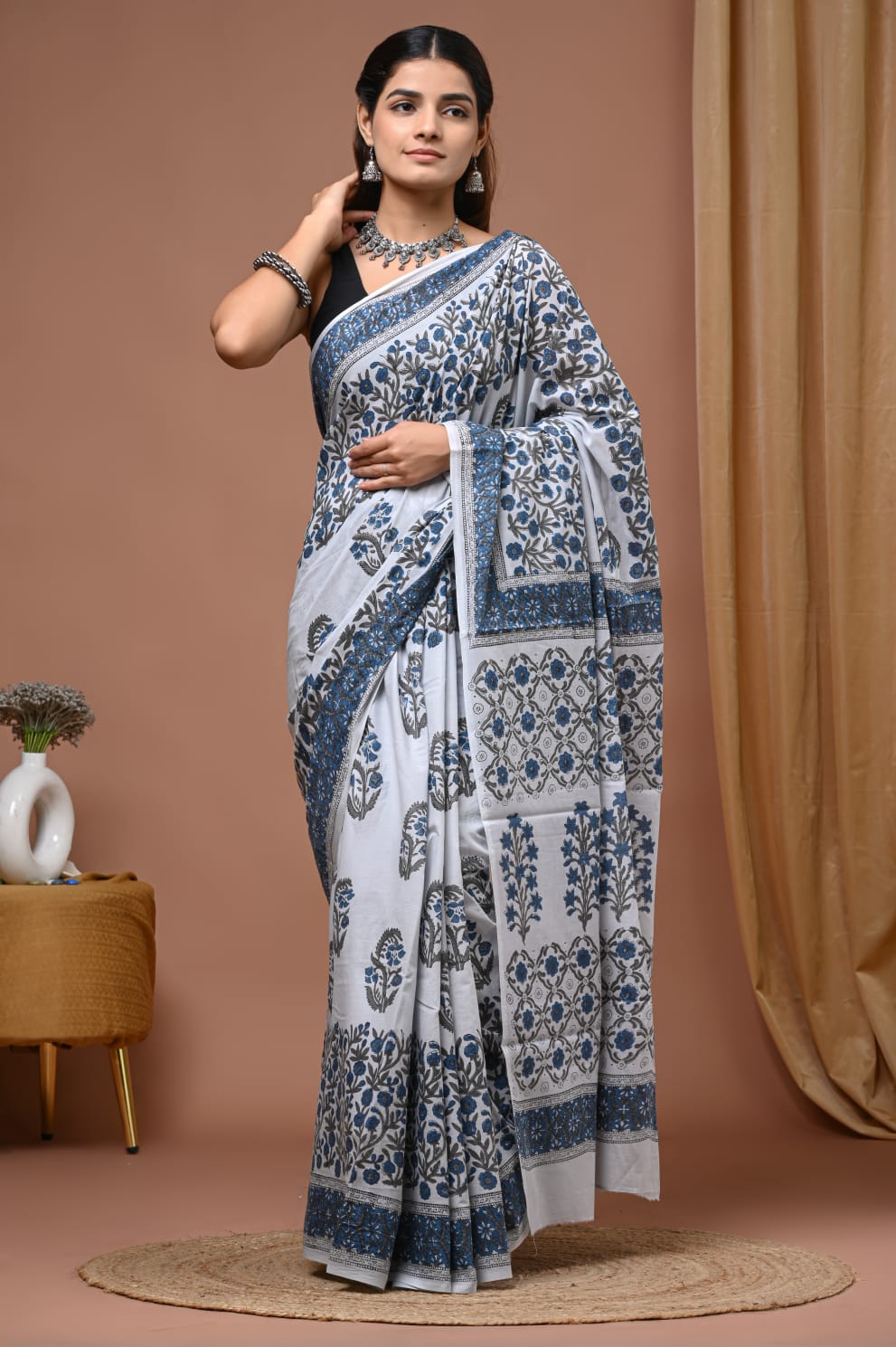 Hand Block Printed Floral Grey Cotton Saree 5.5m