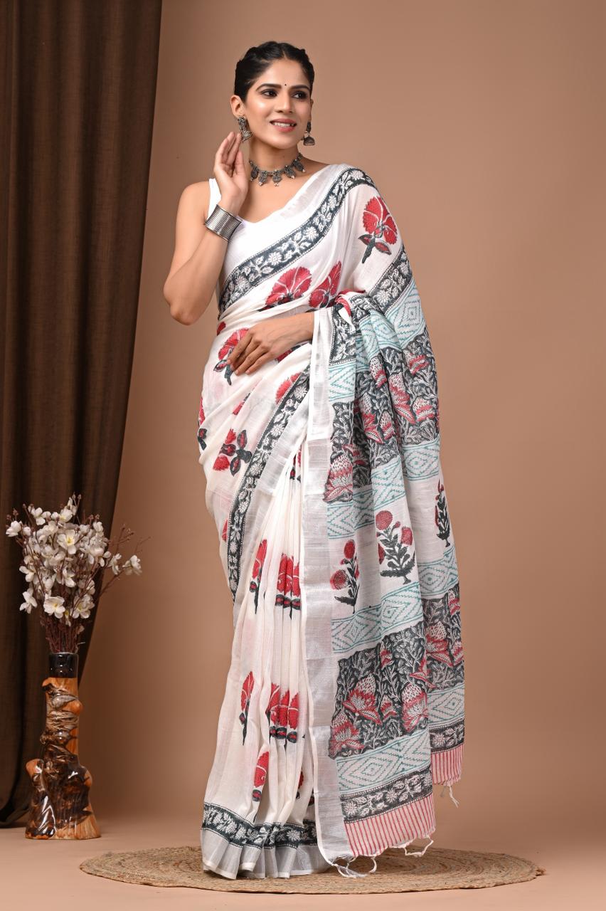 Embrace the timeless elegance of hand block printing with our exquisite Floral Linen Saree. Crafted from premium linen fabric, this saree features a beautiful floral print with red flowers and black stems, accented by intricate patterns in black and light blue on the border. The pallu boasts a detailed floral and geometric design, adding a touch of artisanal charm. Experience the comfort and grace of this lightweight, semi-transparent saree, perfect for casual or semi-formal occasions. Elevate your ethnic wardrobe with this handcrafted masterpiece.