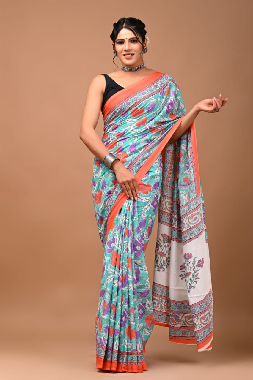 Hand Block Printed Floral Mulmul Cotton Saree in Turquoise and Orange