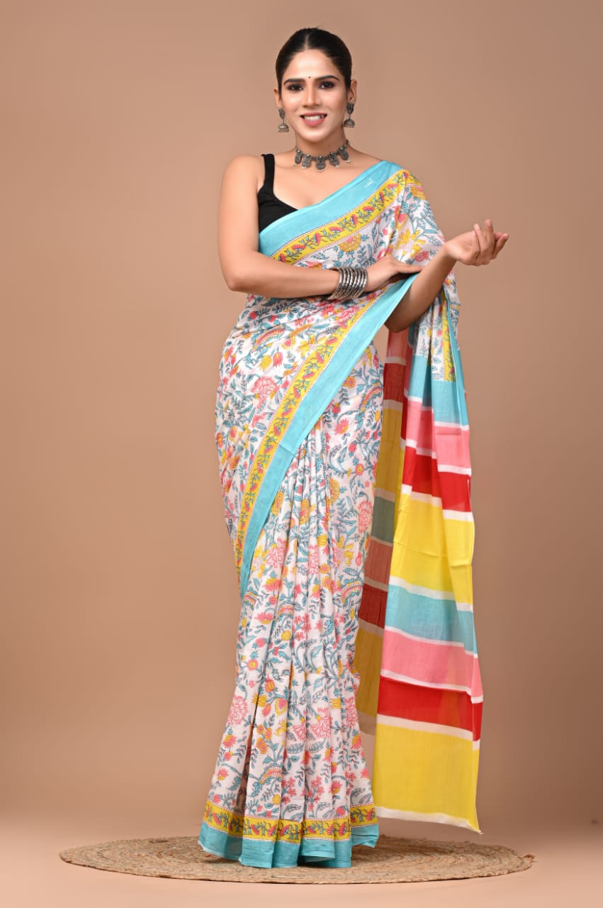 Indulge in the artistry of hand block printing with our exquisite Floral Mulmul Cotton Saree. Crafted from premium cotton, this saree features a vibrant floral print in shades of pink, yellow, and green. The contrasting striped pallu adds a traditional touch, perfect for festive occasions. The lightweight fabric ensures comfort all day long. Elevate your ethnic wardrobe with this artisanal masterpiece. Explore our collection of cotton sarees.