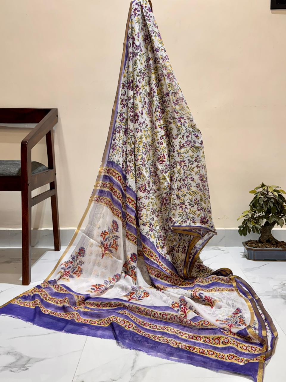 Hand Block Printed Floral Pure Double Diamond Chiffon Saree