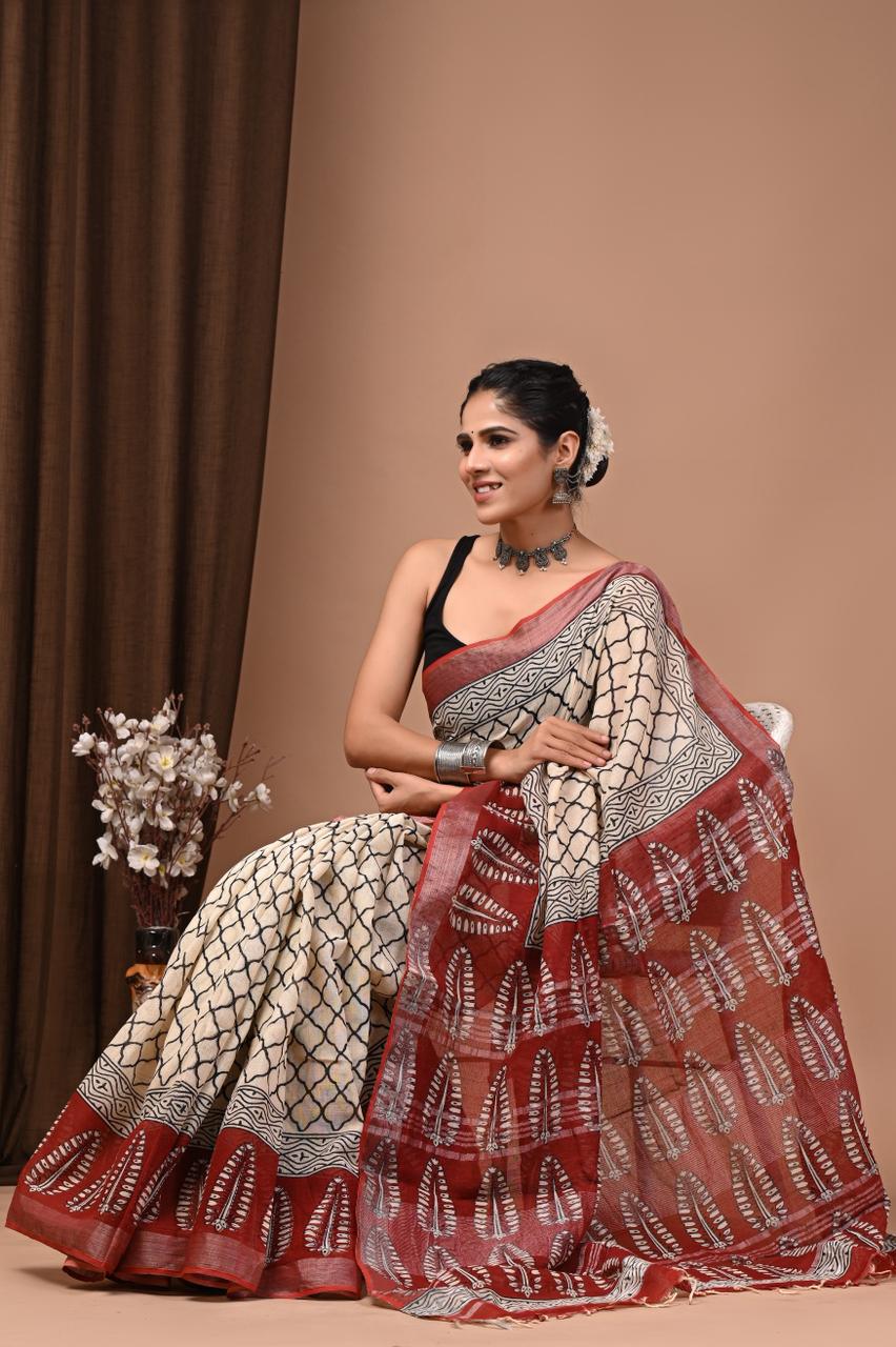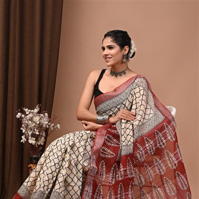 Elevate your ethnic wardrobe with this exquisite hand block printed saree from Blockart. Crafted from premium linen fabric, this saree features a striking geometric and floral pattern in black on an off-white base. The deep reddish-brown border and pallu add a touch of traditional charm. The lightweight and sheer fabric make it perfect for casual or semi-formal occasions. Complete your look with traditional silver jewelry for a truly authentic ensemble. Shop now to embrace Indian craftsmanship at its finest.