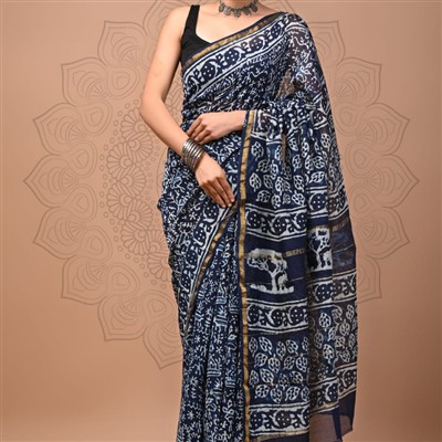 Elevate your ethnic wardrobe with this exquisite Hand Block Printed Golden Tree Chanderi Silk Saree. Crafted with precision, this saree features intricate floral and abstract motifs in white, complemented by a thin golden border for a touch of elegance. The lightweight, semi-transparent chanderi silk fabric ensures comfort and style, making it perfect for casual or semi-formal occasions. Embrace the traditional art of hand block printing with this premium saree.
