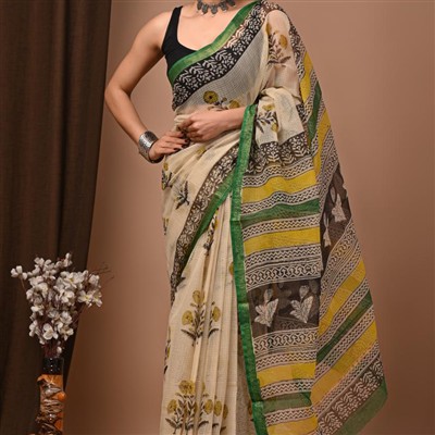 Experience the timeless elegance of hand block printing with our exquisite Kota Doria Saree. Crafted from premium kota doria fabric, this saree features a serene cream base adorned with intricate floral motifs in yellow and brown, complemented by a green border and a detailed pallu in stripes of yellow and green. The lightweight and sheer fabric ensure comfort and grace in every drape. Embrace the artistry and tradition of Indian hand block printing with this ethereal piece.