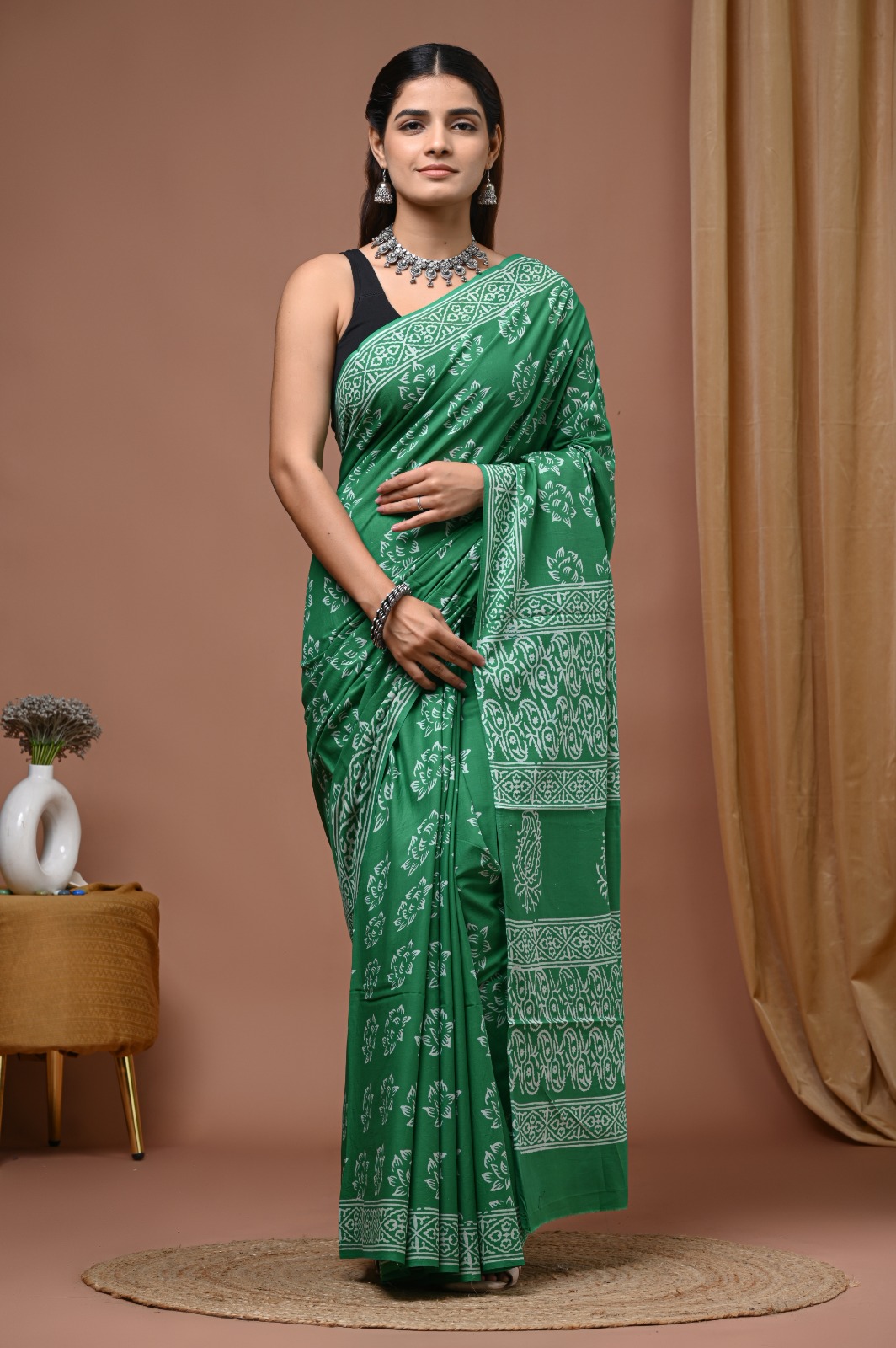 Indulge in the timeless art of hand block printing with our exquisite Green Cotton Saree. Crafted from premium mulmul cotton, this saree features intricate white floral motifs that showcase true artisanal craftsmanship. The 5.5 meters length provides graceful draping, while the matching blouse piece adds a perfect finishing touch. Elevate your ethnic wardrobe with this elegant piece.