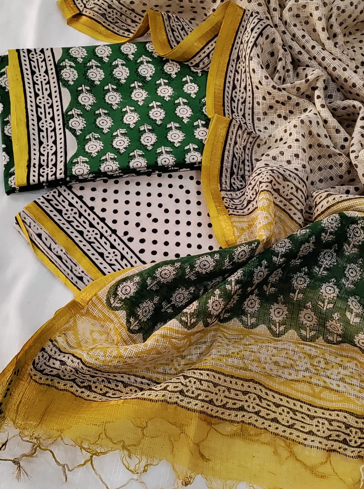 This suit set features a soothing green base adorned with classic hand block motifs, paired with a contrast polka-dotted cotton bottom. The dupatta stands out with intricate block prints and a mustard yellow border, adding a vibrant ethnic touch to the overall look.