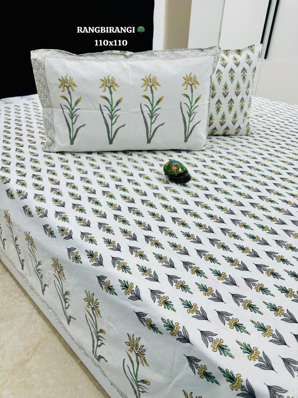 Experience the art of hand block printing with our exquisite Green Floral Cotton Bedding Set. Crafted with premium quality cotton fabric, this jumbo king-size bedsheet and pillow covers offer unmatched comfort and style. The floral pattern in green and yellow hues adds a touch of nature to your bedroom decor. Elevate your living space with this artisanal creation.