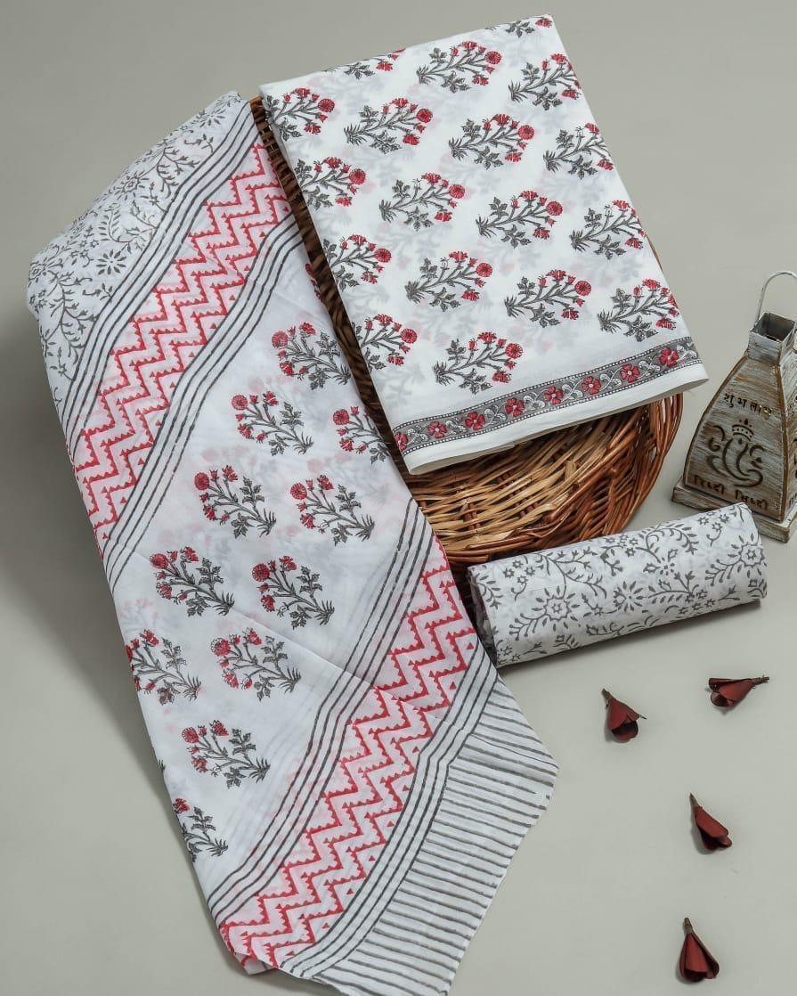 Elevate your wardrobe with this exquisite hand block printed cotton dress material set. Crafted with precision, the grey floral patterns on white cotton fabric exude elegance and tradition. The set includes 2.5 meters each of top, bottom, and duptta fabric for a complete ethnic look.