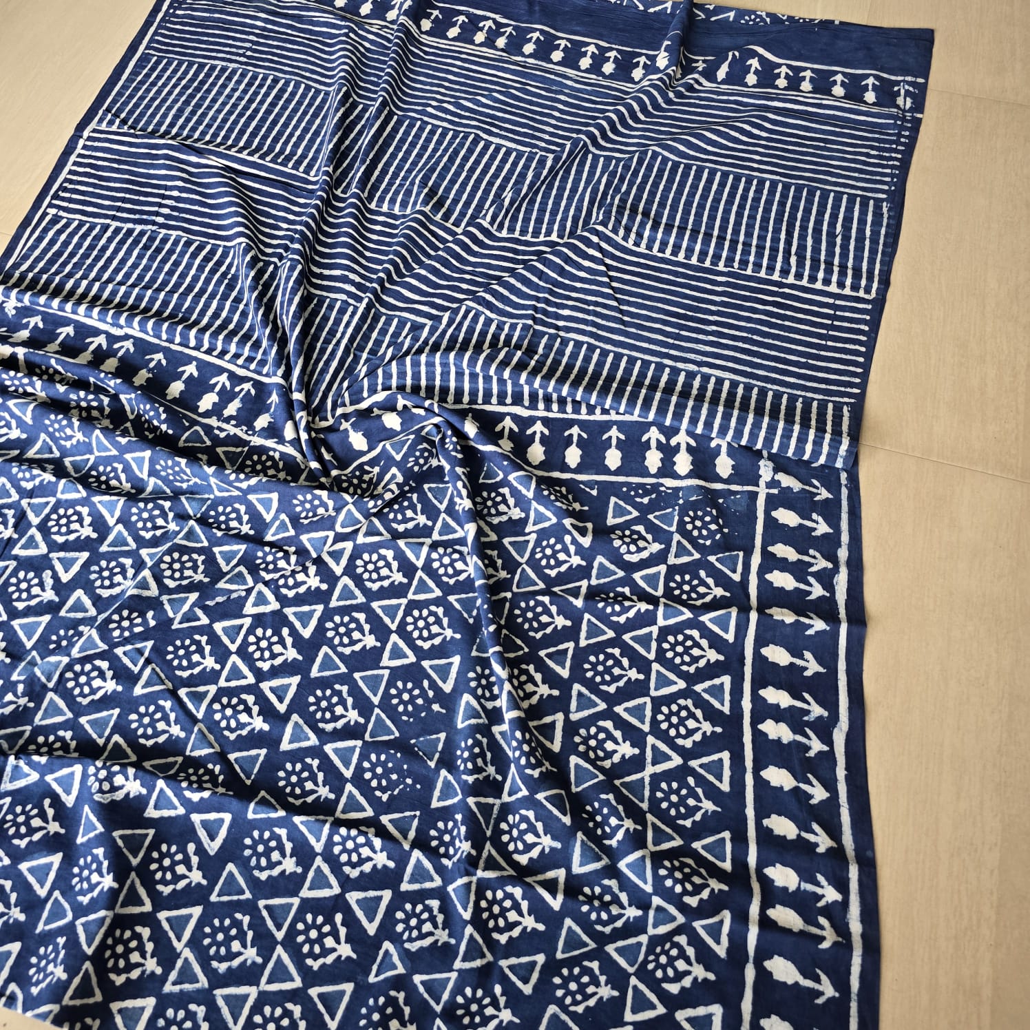 Hand Block Printed Indigo Cotton Saree with Floral Border