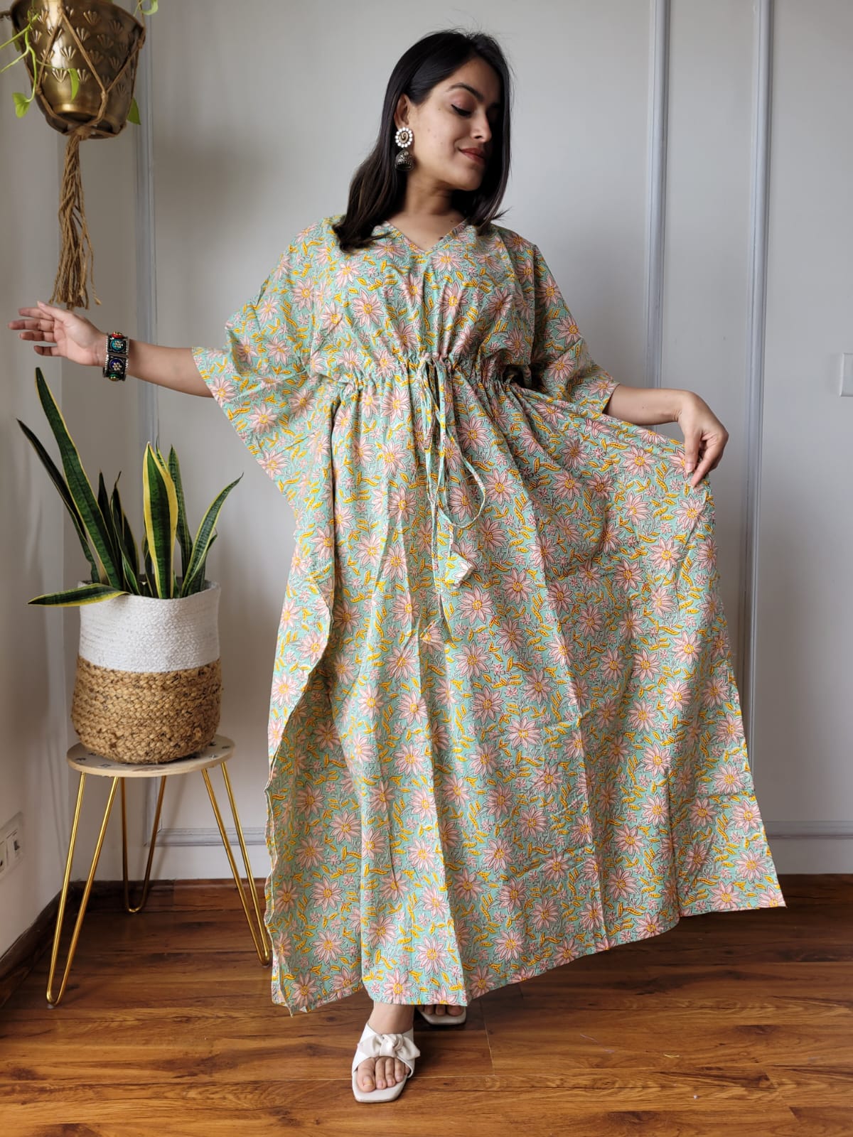 Elevate your style with this exquisite hand block printed cotton kaftan dress. Crafted with premium 100% pure cotton fabric, this dress features a light blue base adorned with a charming floral pattern in pink and yellow-green hues. The V-neckline, adjustable waist tie, flowy wide sleeves, and side slits offer both style and comfort, making it perfect for relaxed or casual summer wear. Embrace the artisanal essence of Indian craftsmanship with this timeless piece.