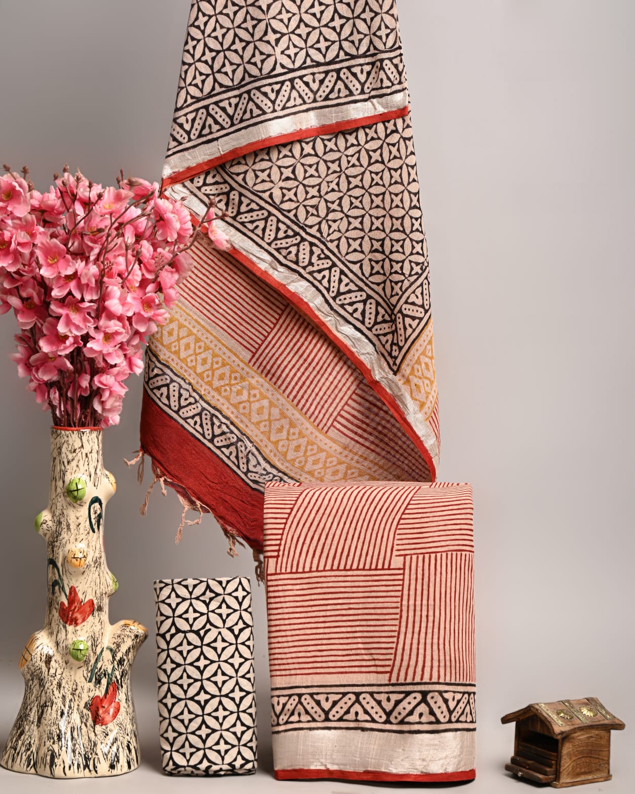 Indulge in the artistry of Bagru hand block printing with this exquisite ensemble. Crafted from premium Linen Cotton fabric, this set features intricate geometric and floral motifs. The top, dupatta, and bottom pieces are designed to perfection, offering comfort and style for ethnic occasions. The silver border adds a touch of elegance to this traditional ensemble, making it a must-have for your wardrobe.