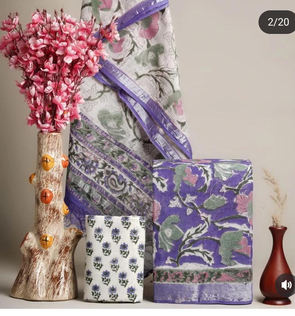 Handblock Printed Linen Suits With Silver Border:
