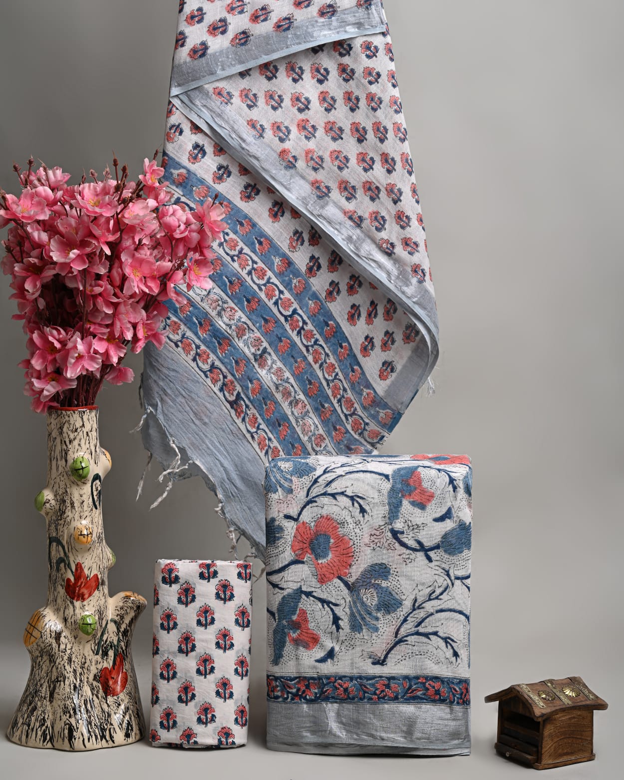 Hand Block Printed Linen Cotton Ethnic Suit Set with Silver Border