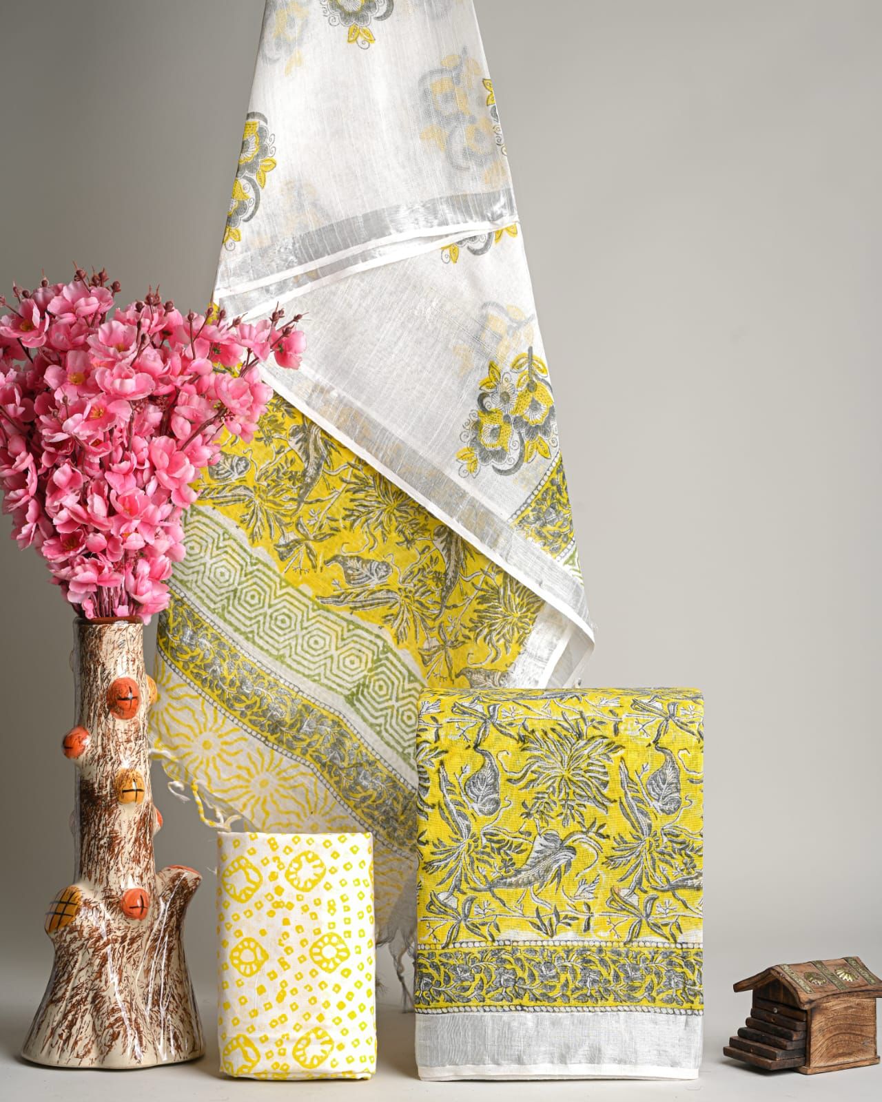 Elevate your wardrobe with this exquisite ethnic suit set featuring Bagru hand block printing on premium Linen Cotton fabric. The set includes a top, dupatta, and bottom, each showcasing traditional motifs and a silver border. Crafted with care and precision, these pieces offer a blend of comfort, style, and craftsmanship.
