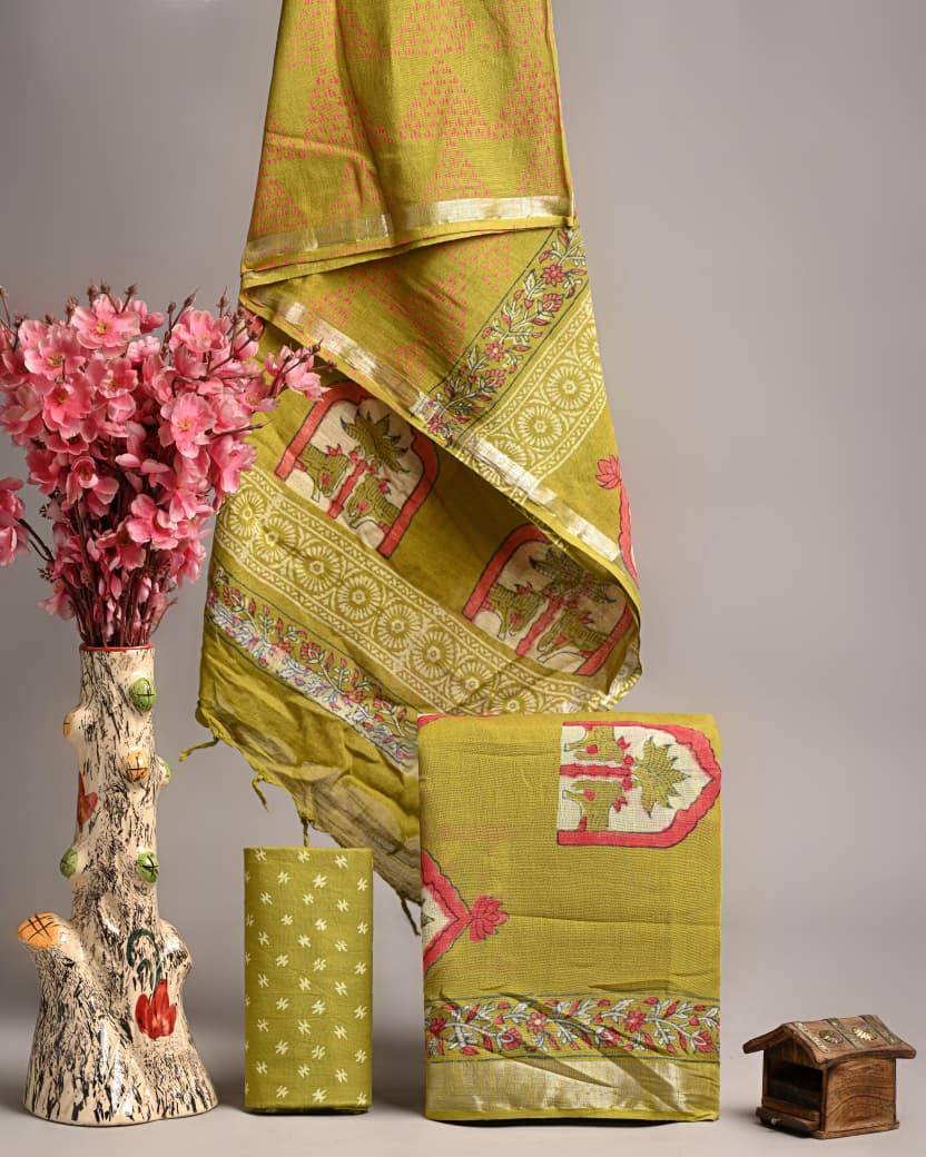 Hand Block Printed Linen Cotton Suit Set with Silver Border