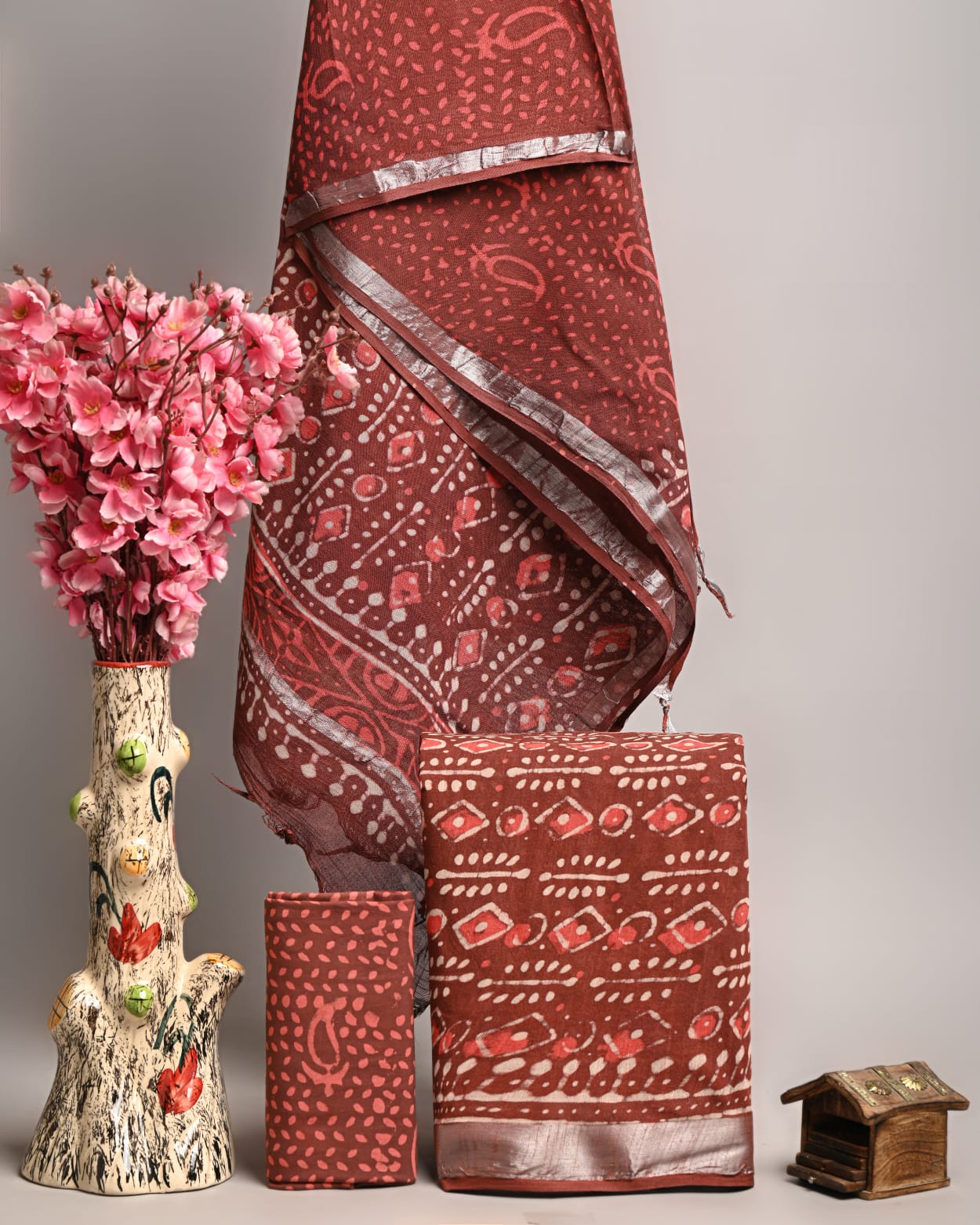 Experience the timeless charm of Bagru hand block prints with this exquisite Linen Cotton Suit Set from Blockart. Crafted with care, this set includes a top, dupatta, and bottom fabric, all adorned with traditional block patterns in deep reddish-brown hues complemented by a shimmering silver border. The linen cotton fabric offers a luxurious drape and comfortable wear, making it perfect for any ethnic occasion. Embrace the artistry and elegance of Indian craftsmanship with this premium ensemble.