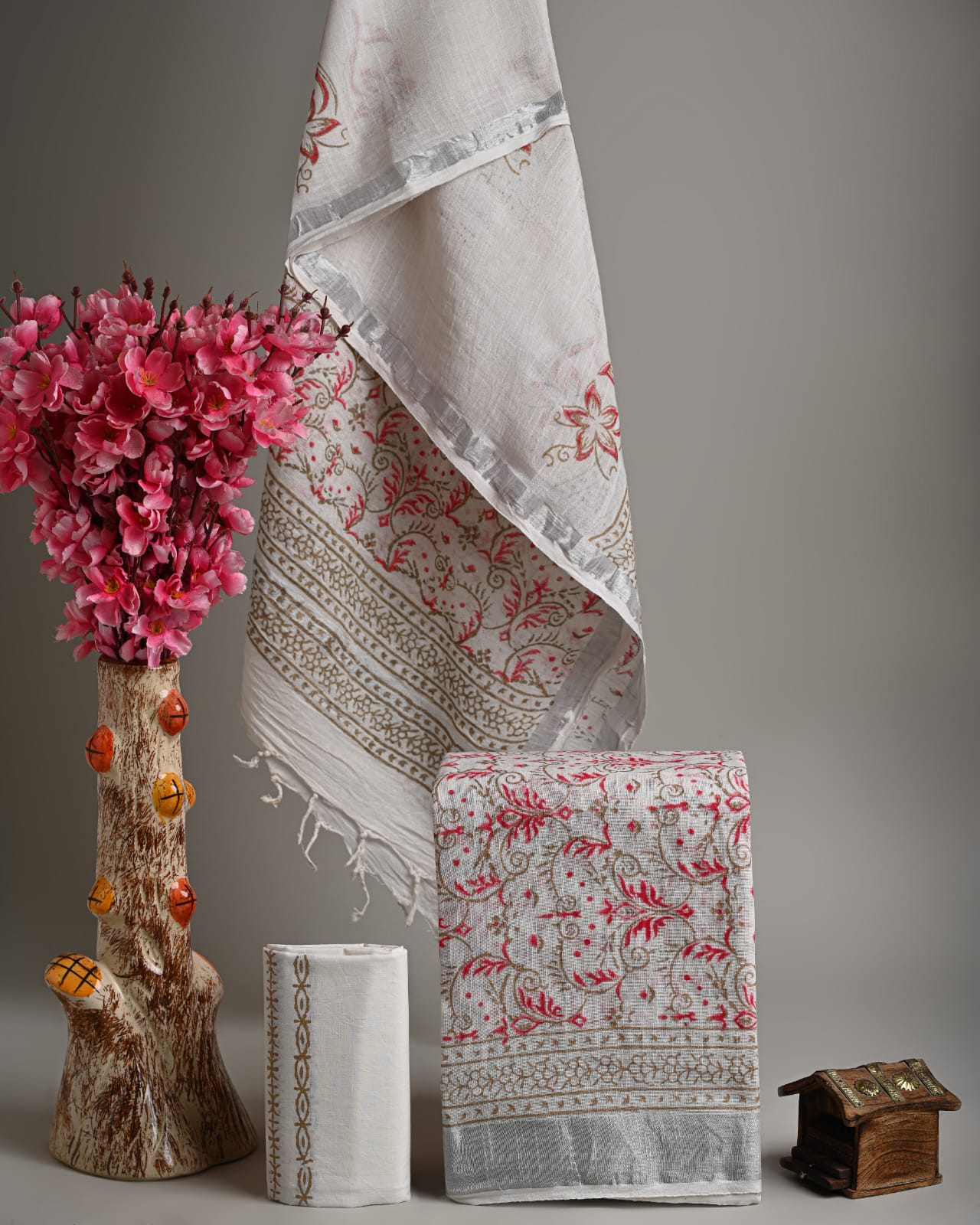 Hand Block Printed Linen Cotton Suit Set with Silver Trim
