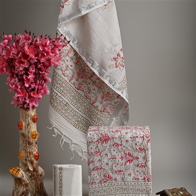 Experience the elegance of Bagru hand block printing with this exquisite linen cotton suit set from Blockart. Crafted with precision on premium quality fabric, this set exudes artisanal charm and traditional Indian craftsmanship. The lightweight and breathable material ensures comfort all day long. Adorned with intricate floral and vine patterns in red and gold, complemented by a silver border, this suit set is a true embodiment of ethnic grace.