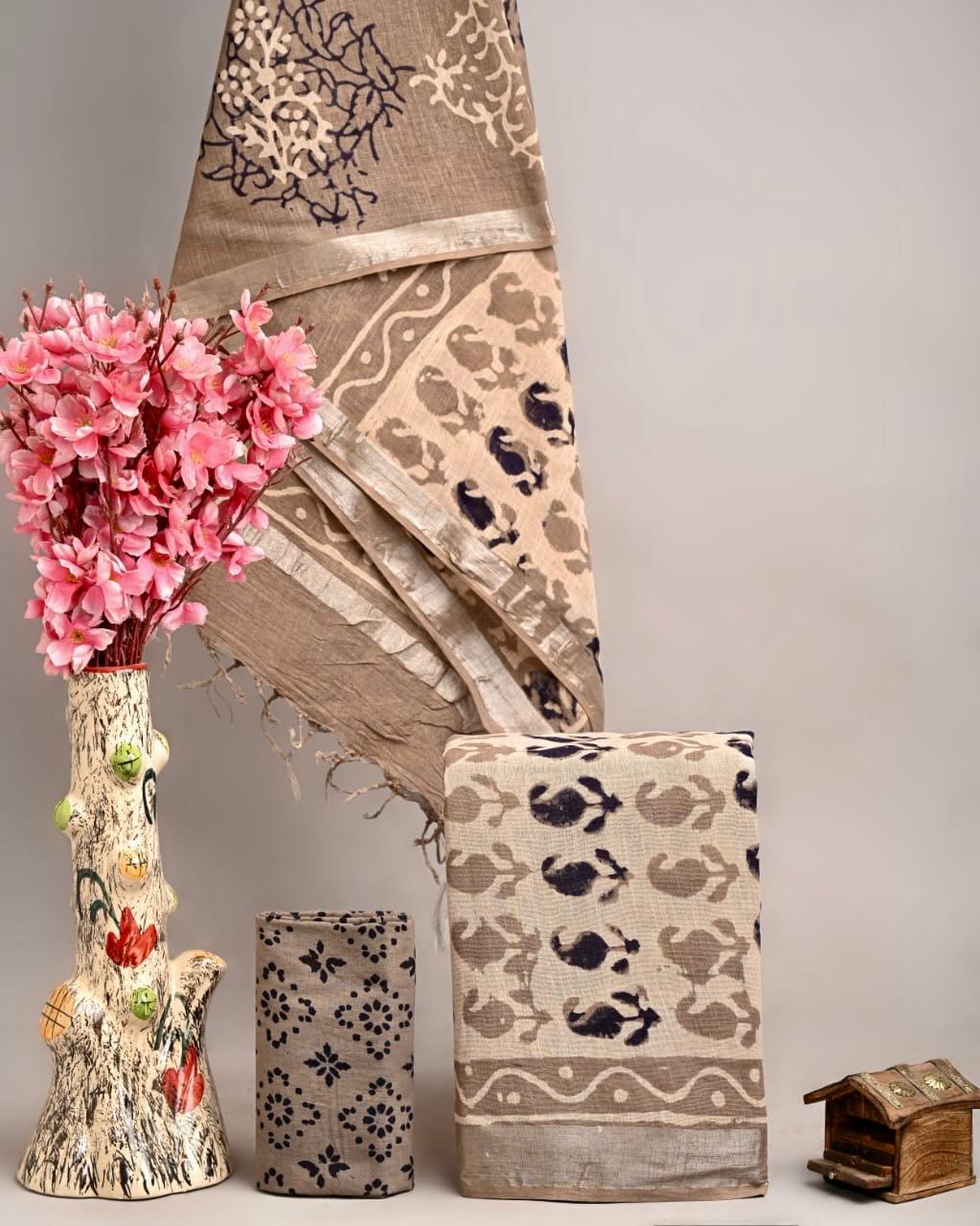Hand Block Printed Linen Cotton Suits with Silver Border Set