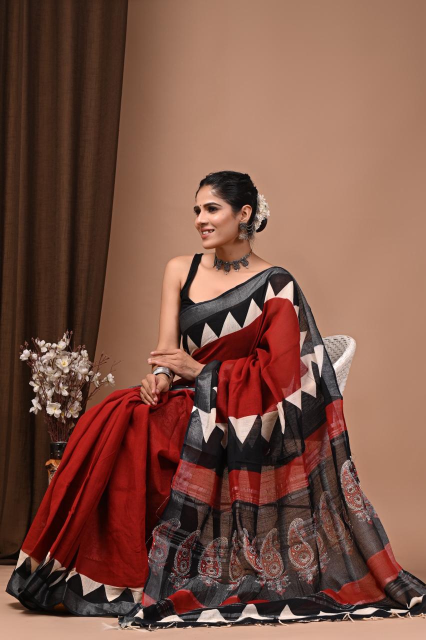 Experience the artistry of hand block printing with our exquisite Linen Saree. Crafted with precision, this saree features a striking geometric border with white triangles and intricate paisley motifs in shades of red, white, and black. Made from lightweight, sheer linen fabric, this saree exudes elegance and comfort. Embrace traditional Indian craftsmanship with this premium ethnic wear.