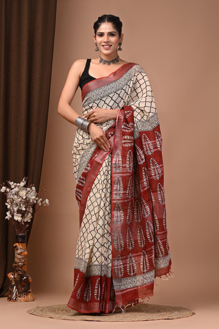 Enhance your traditional look with this hand block printed linen saree, perfect for special occasions and festive gatherings. The timeless design and premium quality make it a must-have in every discerning woman's wardrobe.