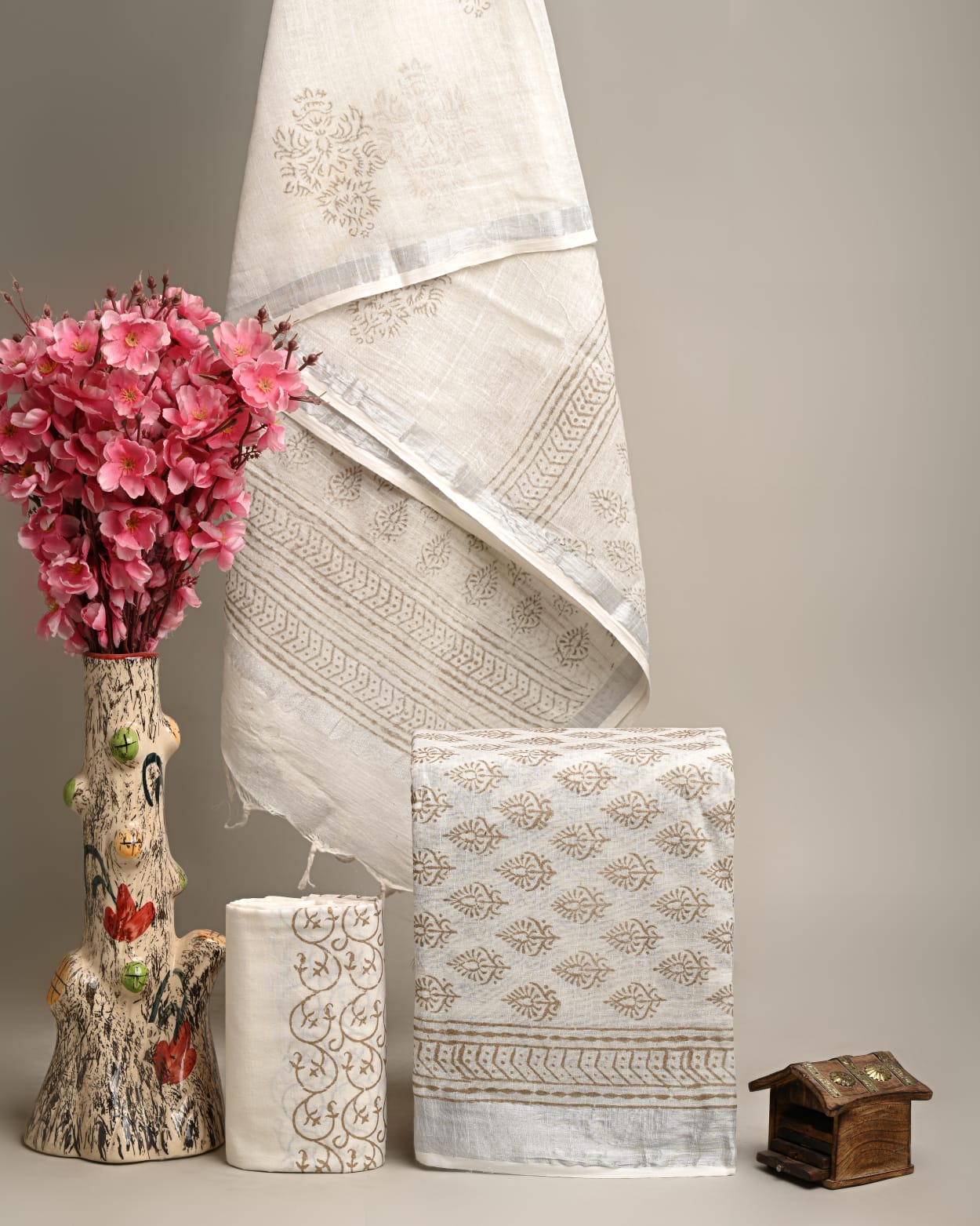 Elevate your ethnic wardrobe with this exquisite Hand Block Printed Linen Suit Set from Blockart. Crafted from premium linen cotton fabric, this set exudes elegance and charm. The intricate hand block printing showcases traditional floral and vine-like patterns, adding a touch of artisanal craftsmanship to your ensemble. The silver border detailing on the dupatta enhances its beauty, making it perfect for special occasions or casual wear. Experience the comfort and style of this handcrafted ensemble that reflects the rich Indian heritage.