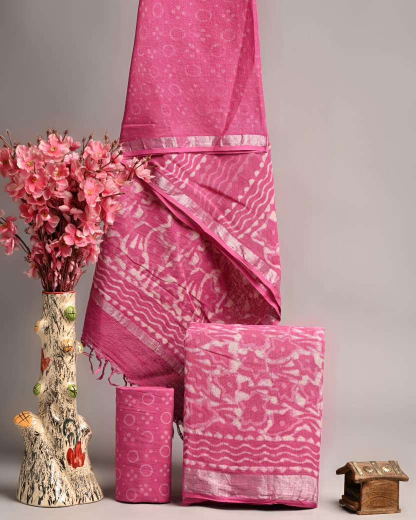 Hand Block Printed Linen Suits in Pink with Silver Border