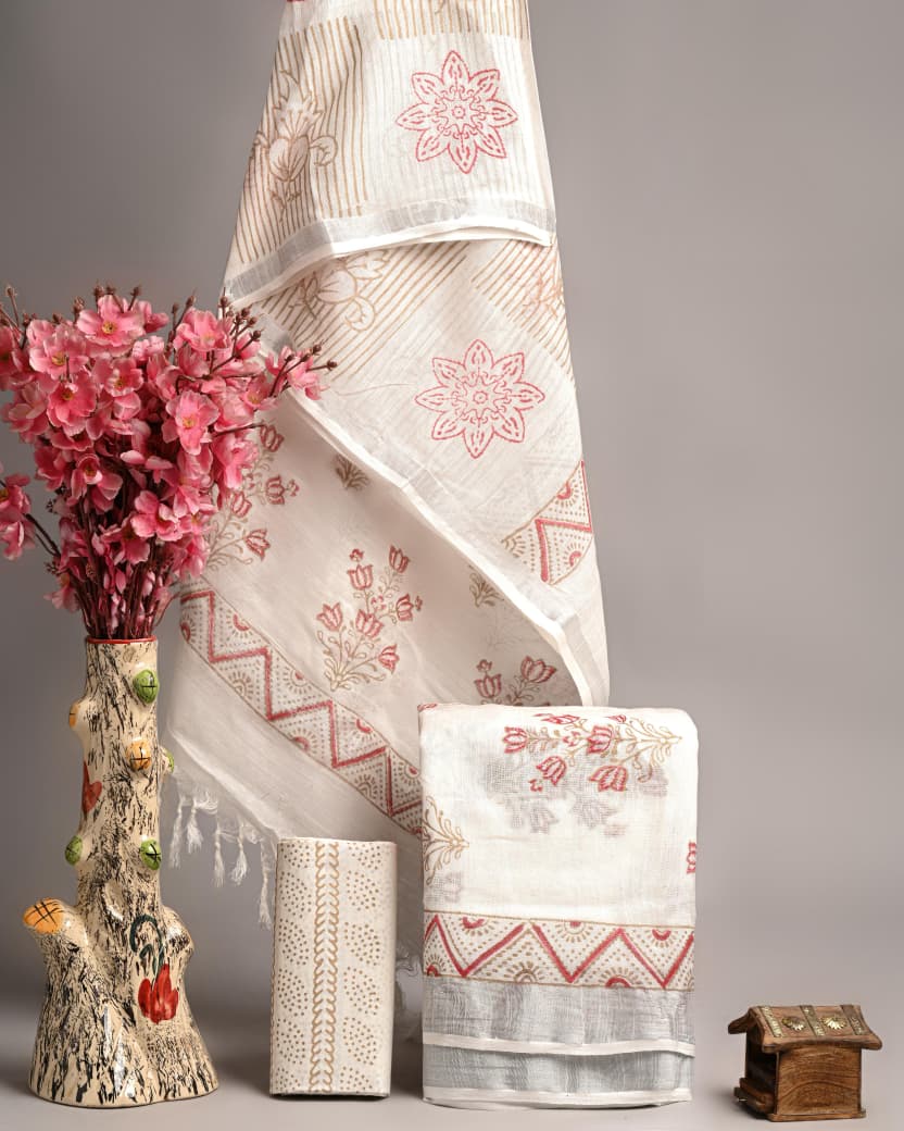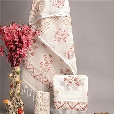 Indulge in the exquisite art of Bagru hand block printing with this premium linen suits set from Blockart. Crafted with care, this set features intricate floral and geometric designs in muted red and beige tones. The linen cotton fabric ensures comfort, while the silver border adds a touch of elegance. Perfect for those who appreciate traditional Indian craftsmanship.