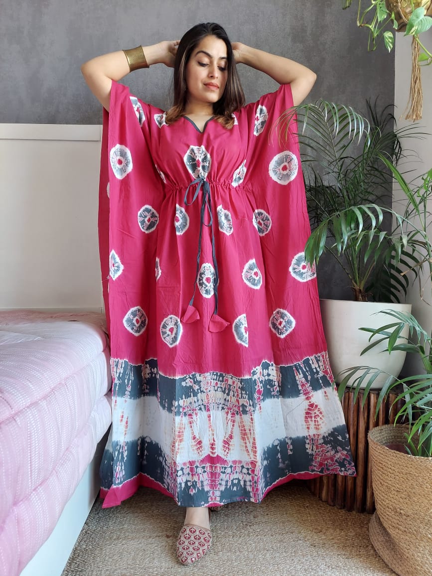 Experience the artistry of hand block printing with our Magenta Cotton Kaftan Dress. Crafted from 100% pure cotton, this dress features a V-neckline with a dark blue/black trim, wide flowy sleeves, and a drawstring tie at the waist for a customized fit. The tie-dye pattern at the bottom and scattered circular motifs add a touch of bohemian charm, making it perfect for relaxed outings.