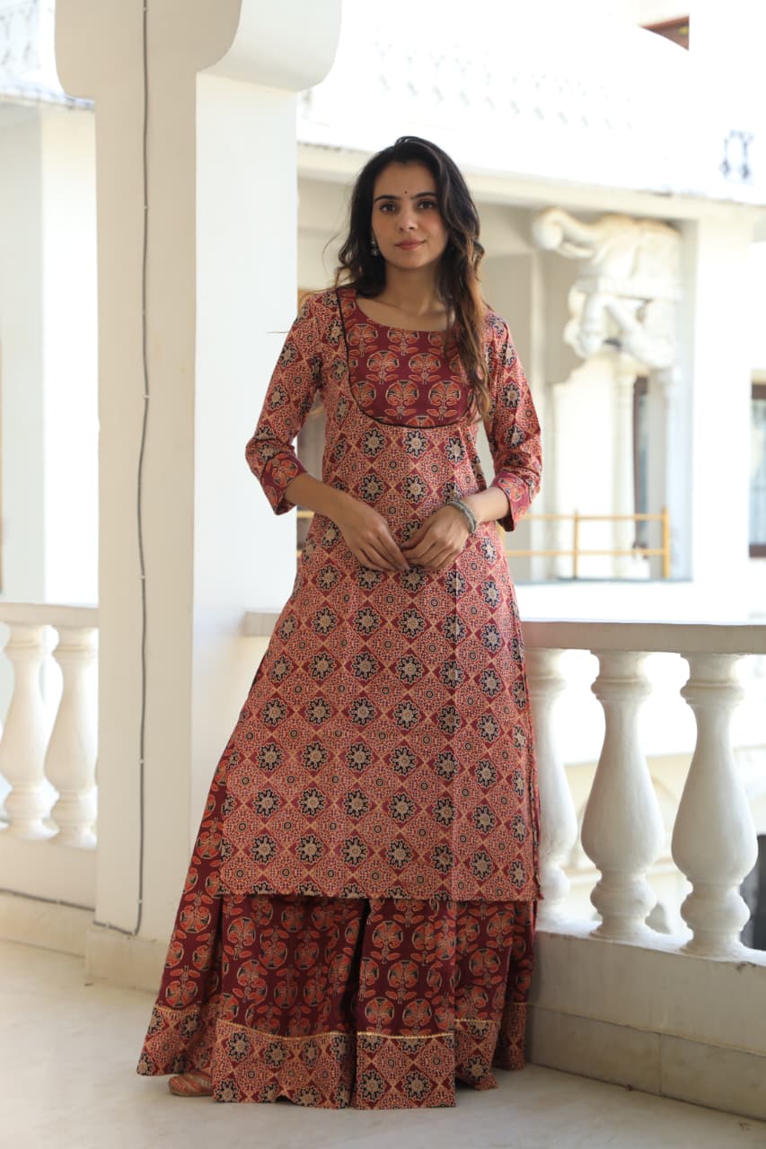 Elevate your ethnic wardrobe with this exquisite handcrafted cotton kurta and skirt set. The maroon ensemble features intricate floral block prints, a round neckline, and three-quarter sleeves, exuding traditional charm. The straight-cut kurta with side slits and the matching skirt with a wide border offer a graceful silhouette. Made from premium cotton, this set ensures comfort and breathability, perfect for casual or semi-formal occasions.