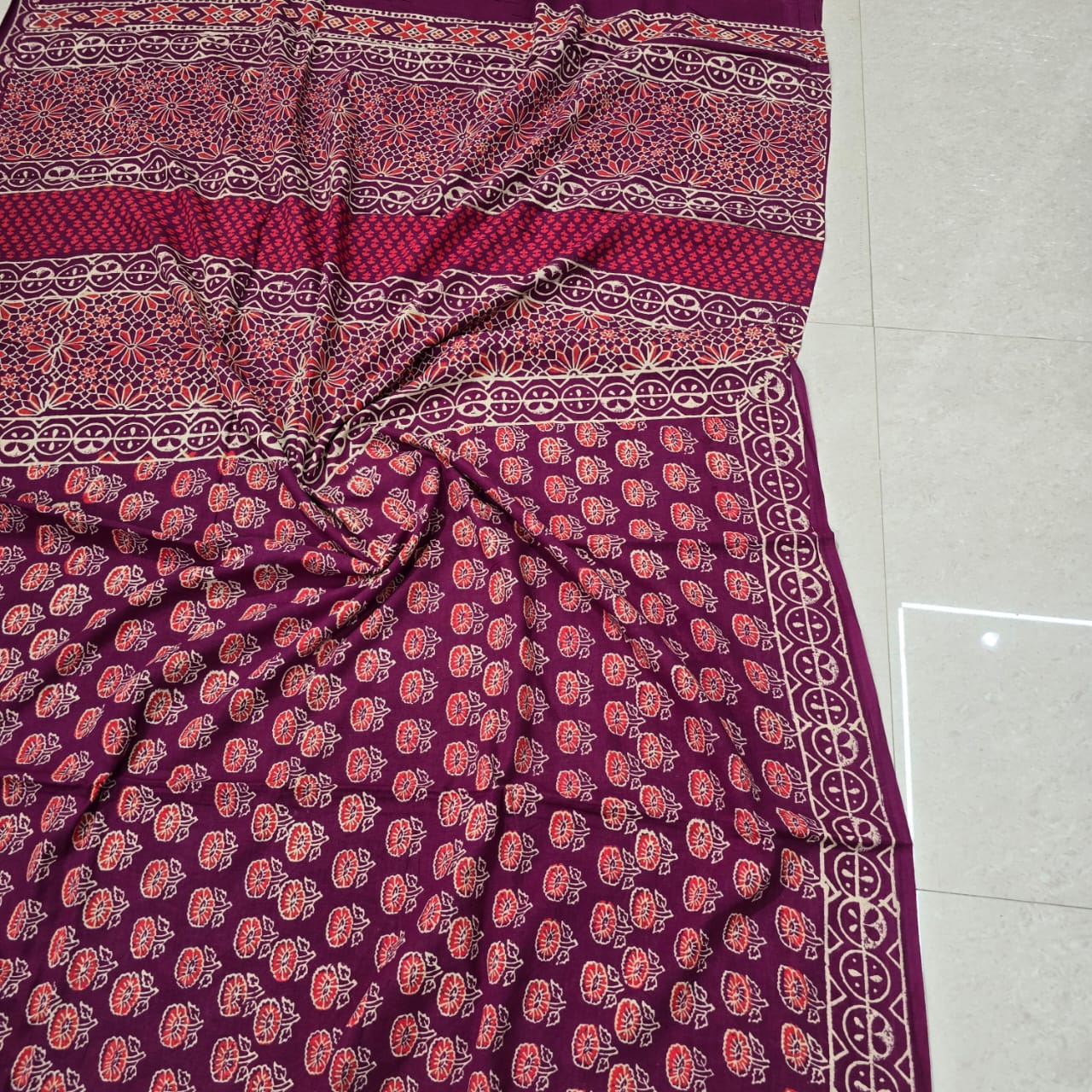 Indulge in the timeless artistry of hand block printing with this exquisite maroon cotton mulmul saree from Blockart. Crafted with care and precision, this saree features intricate floral motifs in vibrant red and orange hues. The soft texture of mulmul cotton offers comfort and elegance, while the super dyeing technique ensures lasting color brilliance. Complete your ethnic look with the matching printed blouse piece that comes with the saree. Elevate your style with this premium, artisanal creation that celebrates traditional Indian craftsmanship.