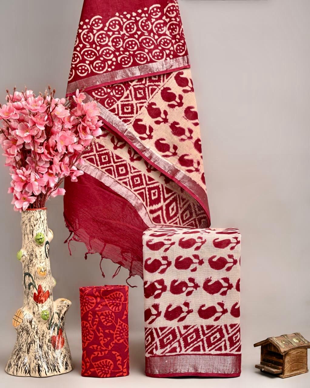 Hand Block Printed Maroon & Cream Linen Cotton Suit Set