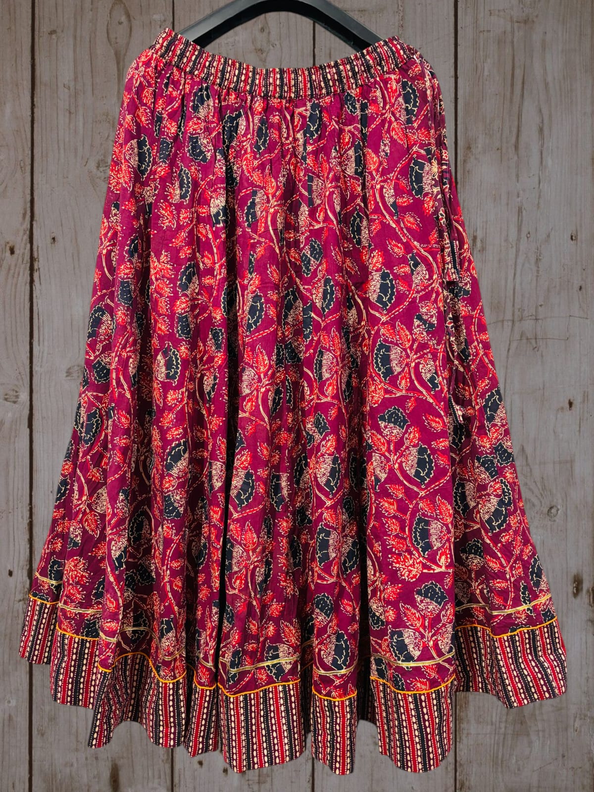 Indulge in the artistry of hand block printing with our exquisite Maroon Floral Cotton Skirt. Crafted from pure cotton, this skirt features a detailed floral and leaf pattern, a gathered design with a significant flare of 5.5 meters, and a contrasting striped border at the hem. The elastic waistband ensures a comfortable and adjustable fit. Perfect for casual or festive occasions. Explore more ethnic wear here.