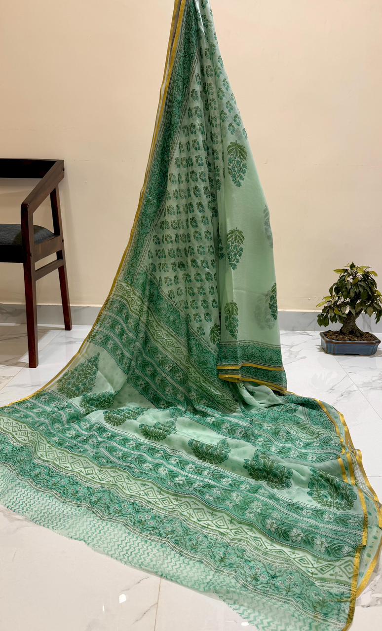 Hand Block Printed Mint Green Chiffon Saree with Yellow Border