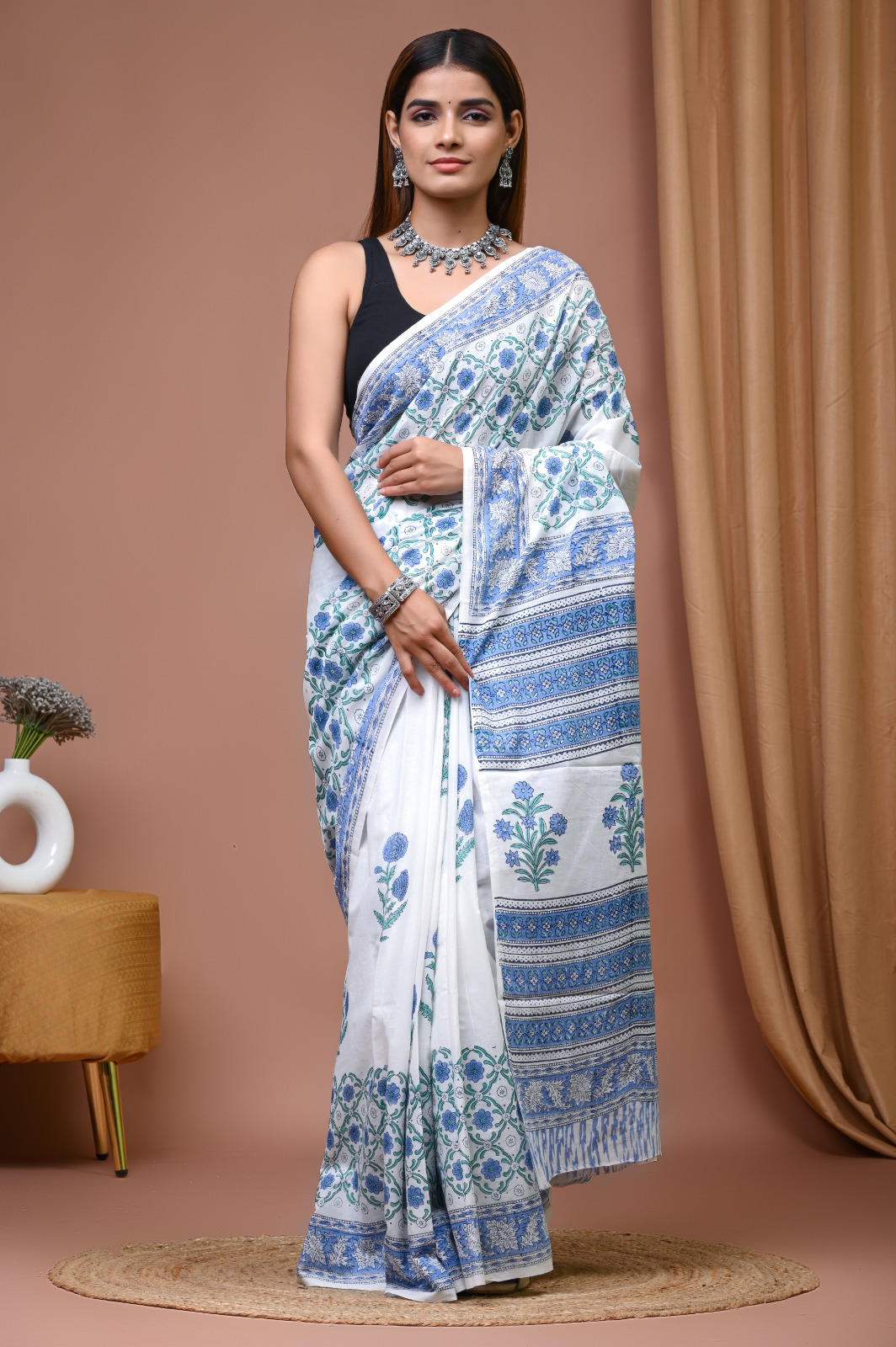 Elevate your ethnic wardrobe with this exquisite Hand Block Printed Mulmul Cotton Saree in Blue and Green Florals. Crafted with precision, this saree features intricate floral and geometric block prints that exude traditional charm. The lightweight, soft cotton fabric ensures comfort all day long, making it ideal for casual or semi-formal occasions. The saree comes with a matching blouse piece for a coordinated look. Embrace the artistry of hand block printing with this premium saree.
