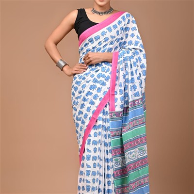 Indulge in the timeless elegance of hand block printing with our Mulmul Cotton Saree. Crafted with care, this saree features charming blue elephant motifs on a white base, complemented by a vibrant pink border. The pallu showcases intricate floral and paisley patterns, adding a playful touch to its traditional appeal. Made from lightweight cotton, this saree ensures comfort without compromising on style. Elevate your ethnic wardrobe with this artisanal masterpiece.