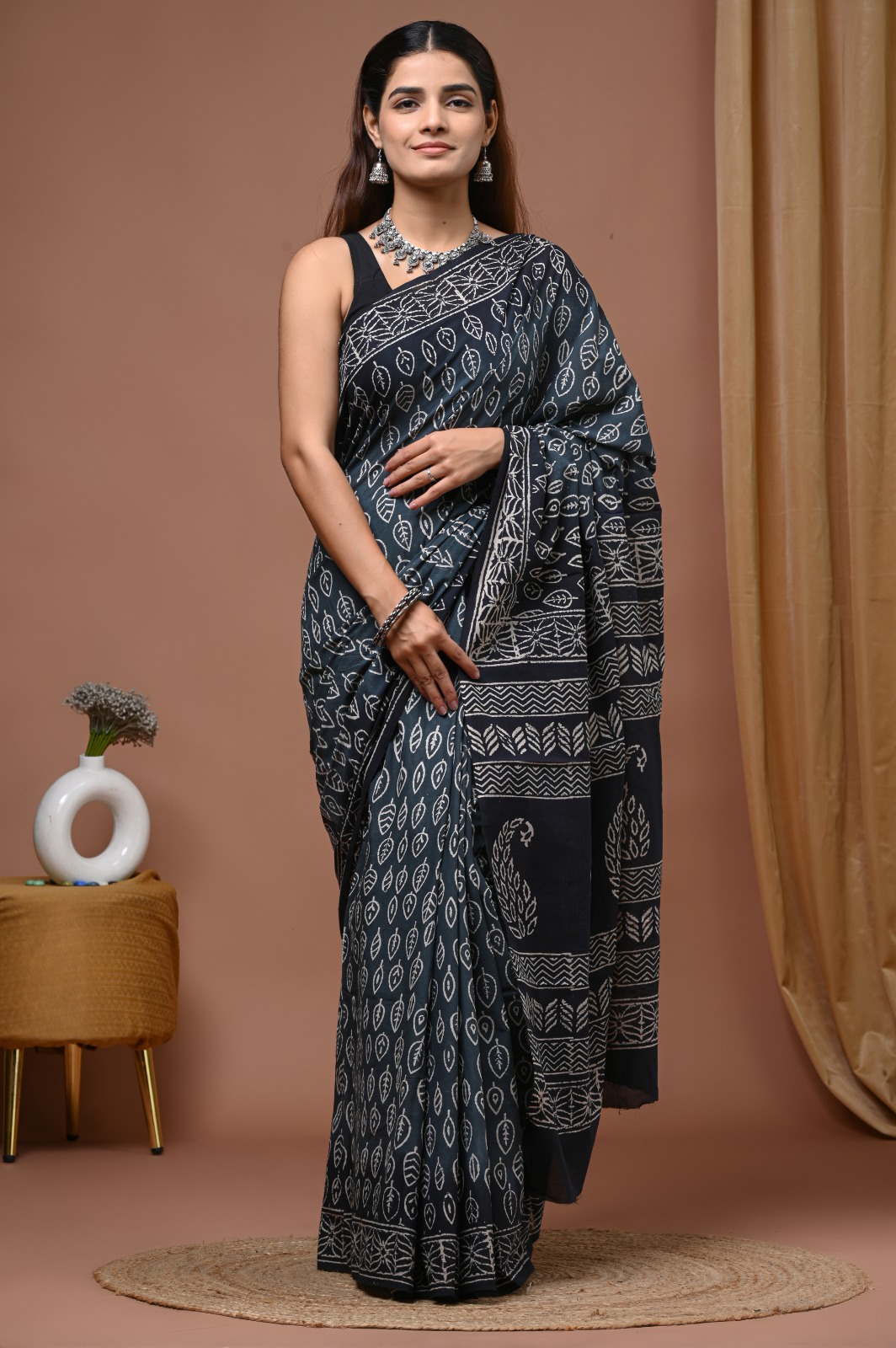 Hand Block Printed Mulmul Cotton Saree in Monochrome Leaf Motif Design